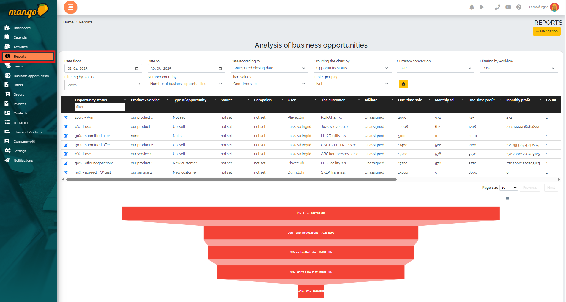 A modo de ejemplo, hemos preparado una descripción general de las oportunidades comerciales para el período del 01.04.2025 al 30.06.2025, es decir, para el segundo trimestre de 2025, que nos permite evaluar fácilmente todas las oportunidades comerciales según criterios predefinidos y proporciona información clara, actualizada y medible sobre el estado y el desarrollo de acuerdos potenciales: