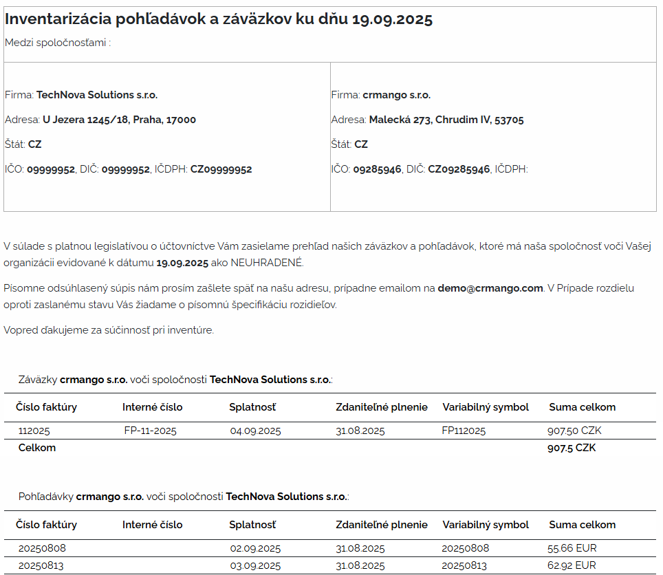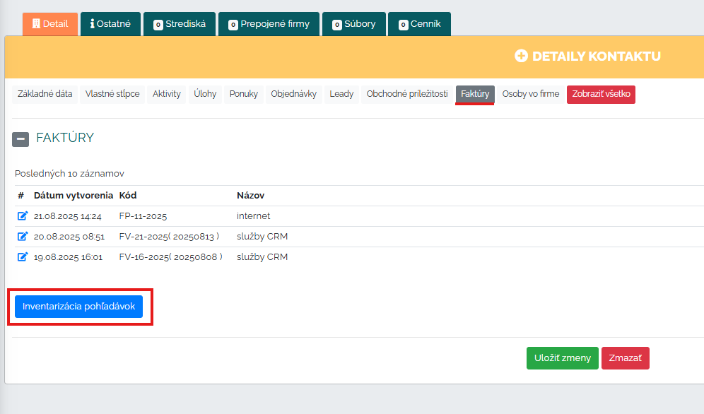 Ide o proces overenia skutočného stavu záväzkov spoločnosti a ich porovnania s údajmi v účtovníctve s cieľom preveriť a zabezpečiť správnosť a zistiť prípadne rozdiely. Veľmi zjednodušene povedané, ide o to čo ja ako firma niekomu dlžím a čo iné firmy dlžia mne k danému dátumu. Tento proces máme v CRM Mango rovnako podchytený. Stačí, ak si konkrétnu firmu, ktorú potrebujeme skontrolovať otvoríme v adresári. Preklikneme sa do časti Faktúry a stlačíme tlačidlo "inventarizácia pohľadávok".