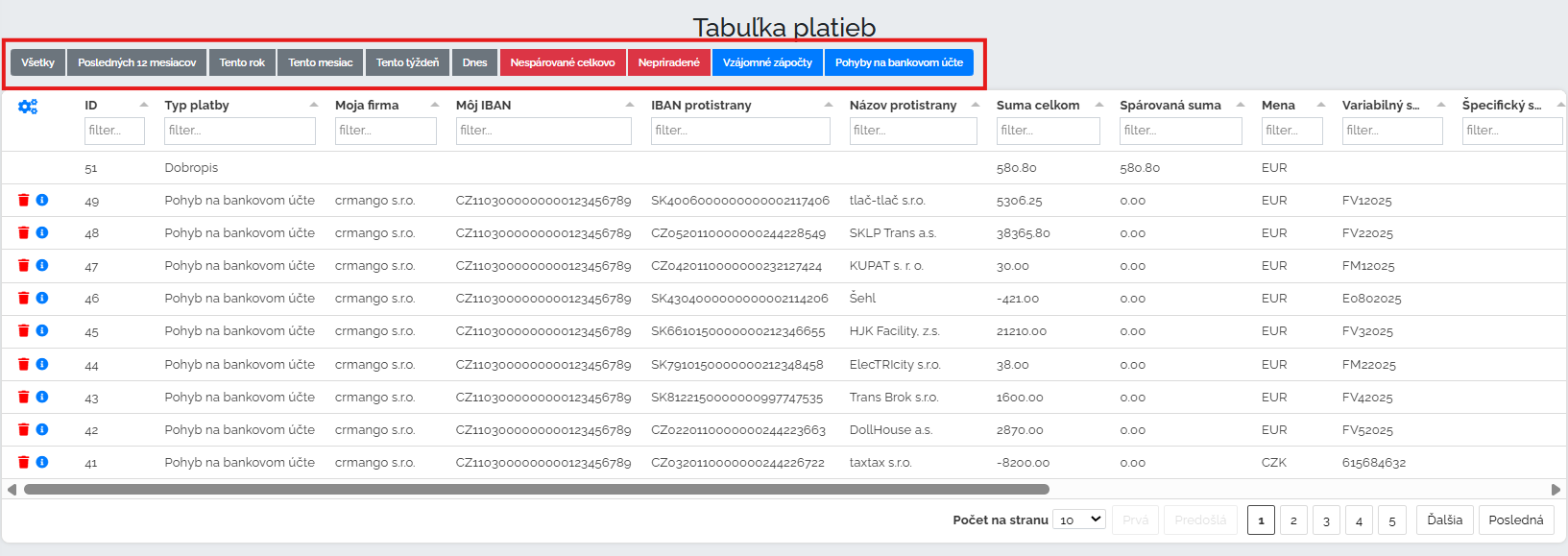 Tak ako v každej časti tejto stránky, či už ide o faktúry prijaté, vydaná, dobropisy, náklady, zápočty, tak aj v časti platby nájdete rýchle filtre. Čo sú rýchle filtre? Svietia nám ako šikovné záložky vždy na vrchnej časti stránky a umožňujú nám trošku rýchlejšie a prehľadnejšie získať to čo najčastejšie potrebujeme vedieť. V týchto rýchlych filtroch vidíme napríklad všetky platby za posledných 12 mesiacov alebo iba tento mesiac, prípadne nespárované platby a podobne.