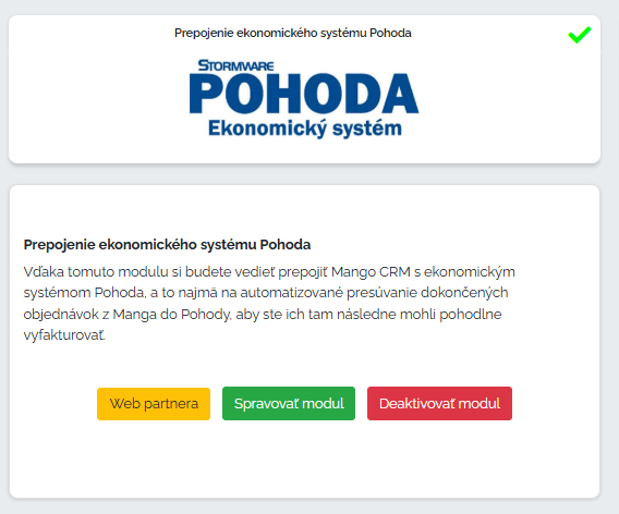 Spojenie moderného CRM systému Mango a účtovného softvéru Pohoda prináša firmám praktické riešenie, ktoré prepája obchodné a účtovné oddelenia do jedného funkčného celku. Firmy tak získavajú komfort práce v prehľadom prostredí CRM Mango a zároveň istotu, že všetky dáta sú pripravené pre účtovníctvo v Pohode. Toto prepojenie si viete jednoducho aktivovať a spravovať v rozširujúcich moduloch nášho CRM systému.