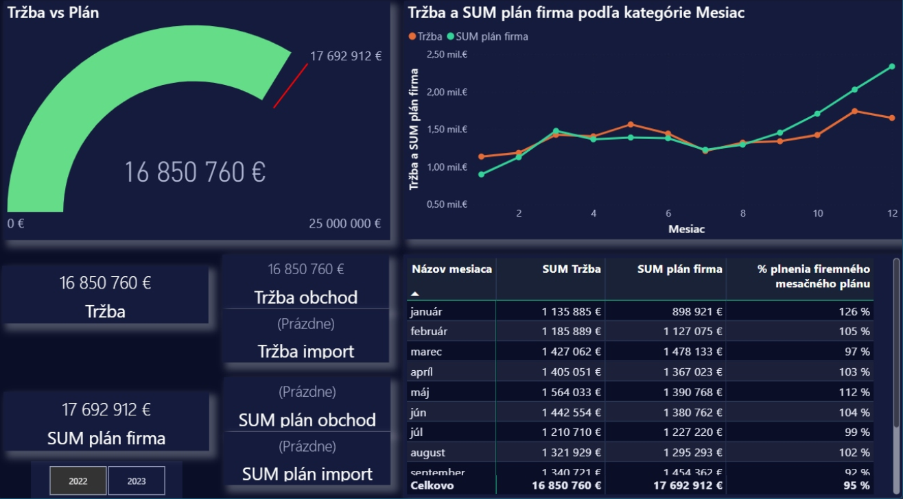 - Distribúcia a veľkoobchod - tržby, marže, zásoby, výkon obchodníkov.