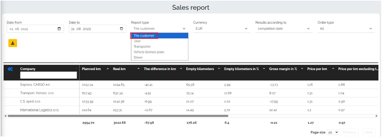 - typ reportu (Zákazník, Užívateľ, Prepravca, ŠPZ vozidla, Vodič),