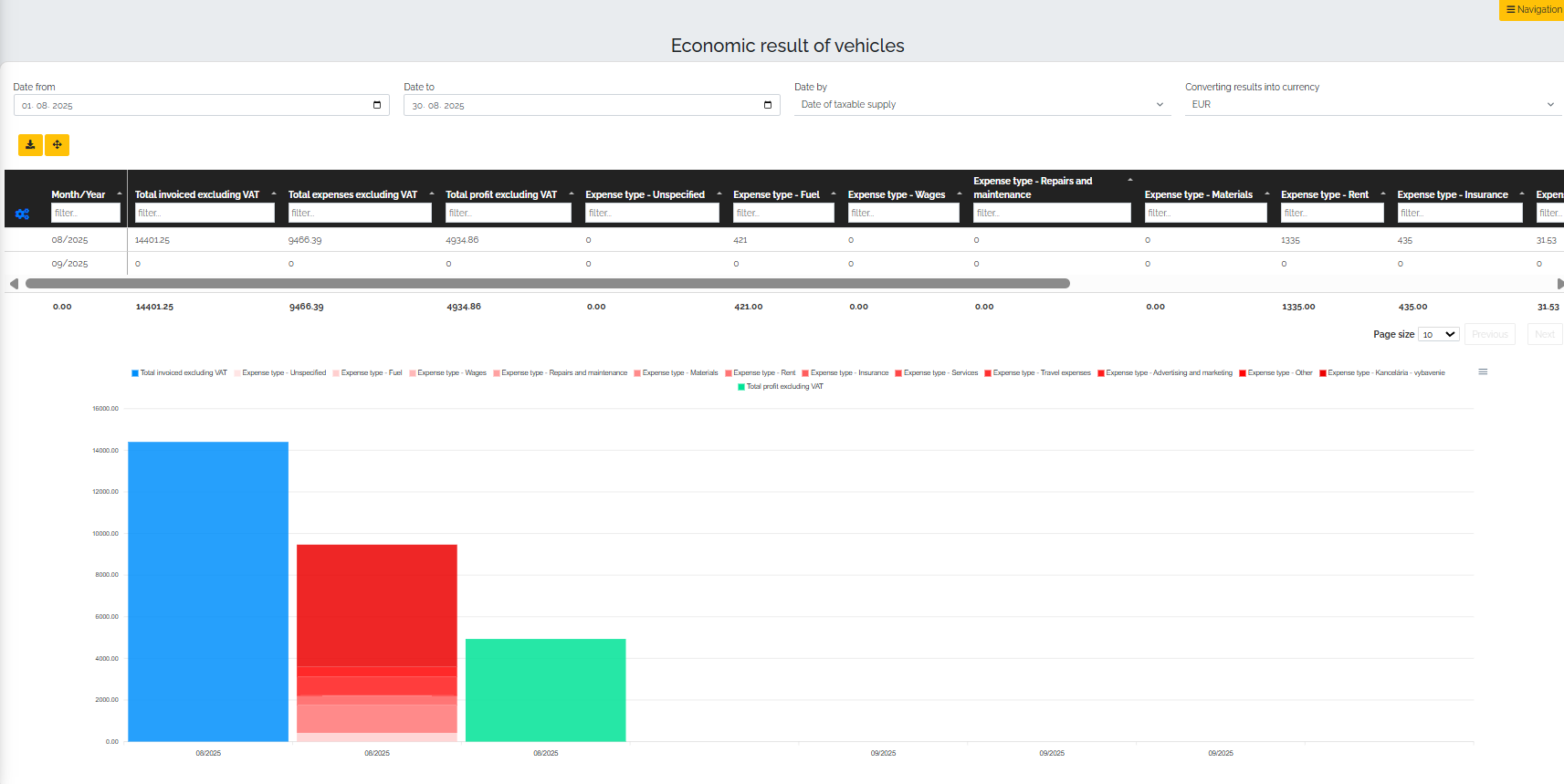 Výhodou je aj farebné rozlíšenie podľa kategórií, takže okamžite vidíte aká položka firmu stojí najviac. Report je možné sledovať mesačne a dáta viete jednoducho exportovať v prípade potreby do MS Excel.