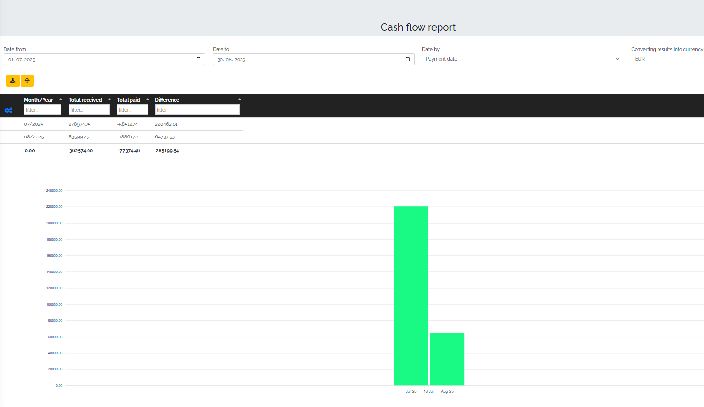 Mnohé firmy na papieri vykazujú zisk, ale na účte im chýbajú peniaze. Preto je kľúčový report Cash-Flow, ktorý zobrazuje, koľko finančných prostriedkov nám za zvolené obdobie prišlo na účet - t.j. koľko faktúr zákazníci skutočne uhradili a koľko peňazí nám z účtu odišlo ako naše výdavky. Tým pádom vidíme rozdiel medzi súčtom prijatých a odoslaných platieb.