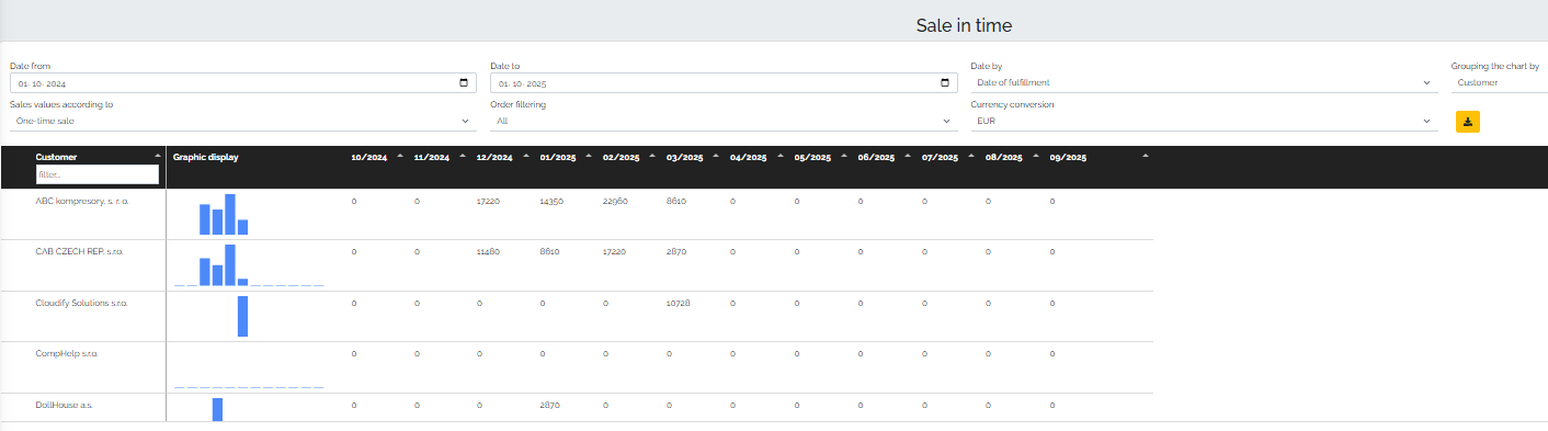 Tento report vám umožní sledovať predaje podľa zákazníka, obchodníka alebo konkrétneho produktu/ služby, ale na časovej osi. Vidíte, kto nakupuje pravidelne, či niekto zo zákazníkov prestal odoberať, prípadne, ktoré produkty sa predávajú najviac vo vybranom časovom období.